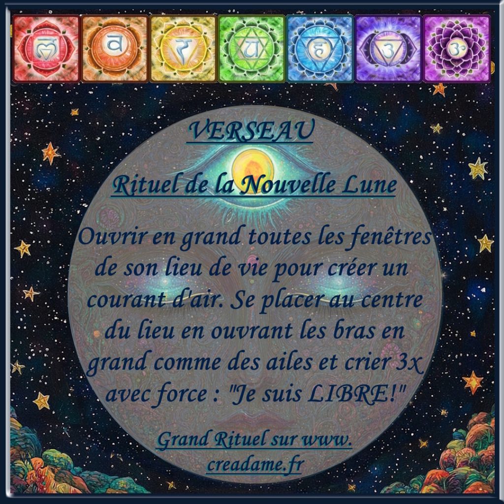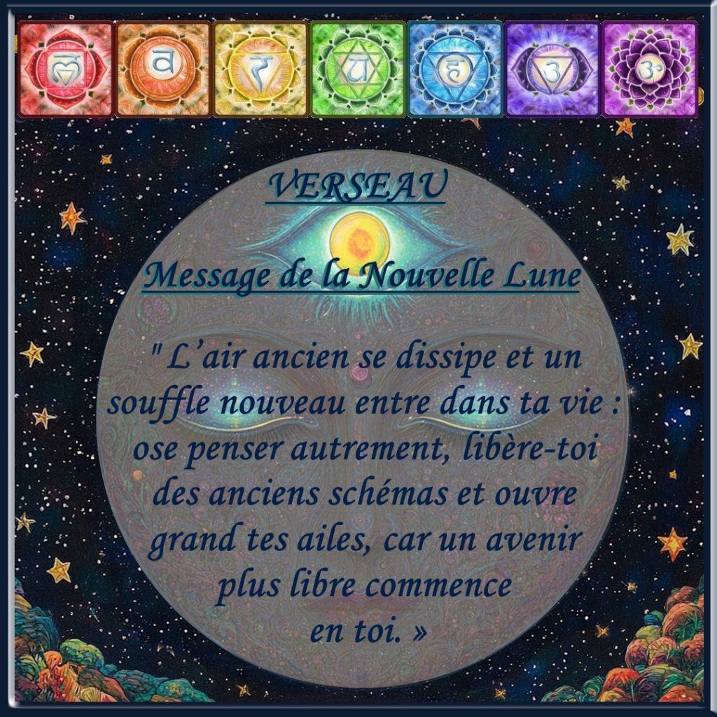 « En cette Nouvelle Lune en Verseau, je me rends disponible à l’appel sincère de mon âme. Je me libère avec bienveillance des pensées, peurs et anciens schémas qui ne me ressemblent plus, et j’accueille avec confiance les visions nouvelles qui s’éveillent en moi, guidant mon cœur vers plus de liberté, de vérité et de conscience. »